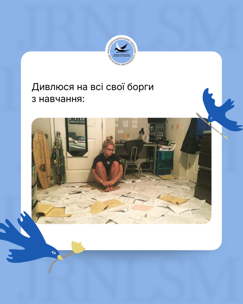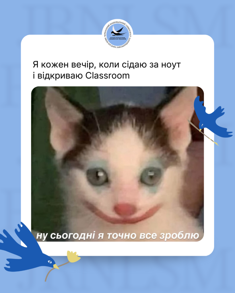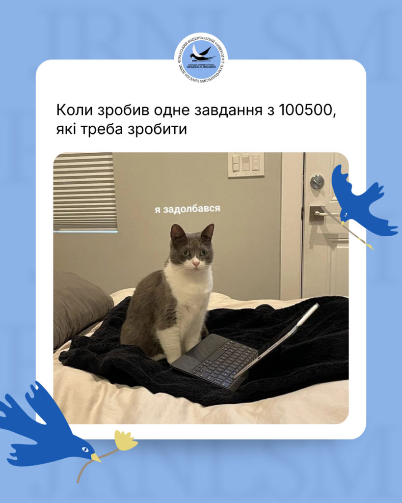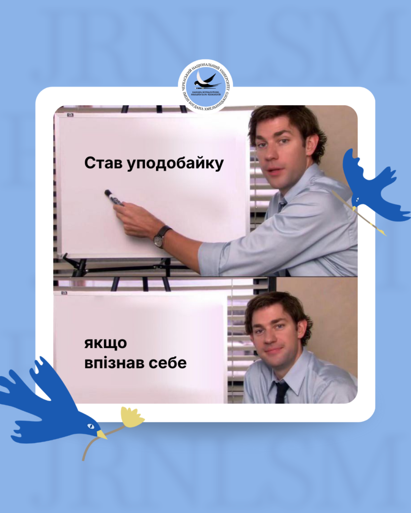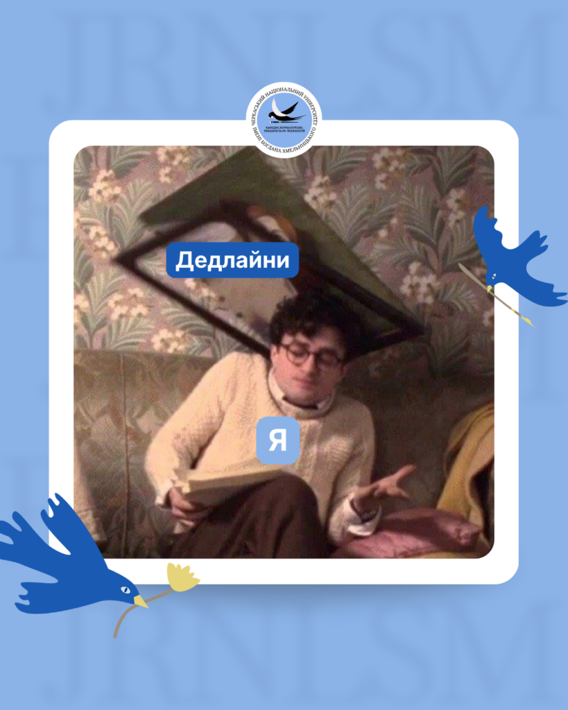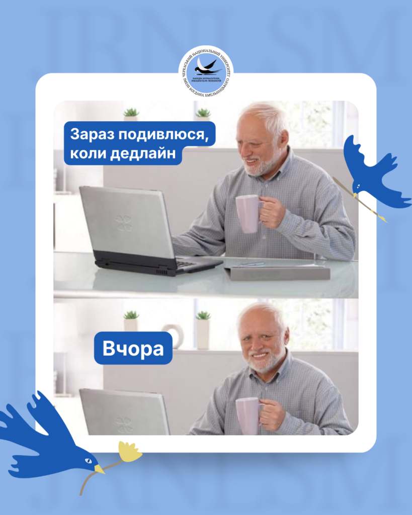 Меми. Дедлайни горять Понеділок, 5 Січня 2026 Головна > Відео > Проєкти > Фото Проєкт виготовлено магістранткою Вікторією Дирко в межах кваліфікаційної роботи. Коментарі: Схожі новини: